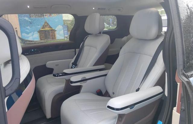 后排15.6英寸车载影院,采用2+2+3式的7座布局,座椅采用Nappa真皮材质包覆,第二排配备两张独立座椅,提供电动腿托、座椅通风/加热、按摩功能,配备折叠桌板,调节页面设置在了车门内侧,很有新意。